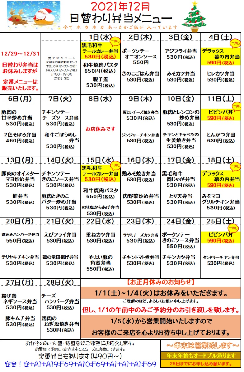 12 012021 12月の日替わりメニュー お知らせ Tweet Share Hatena Pocket RSS feedly Pin it 11月の日替わりメニュー 前の記事 1月の日替わりメニュー 次の記事