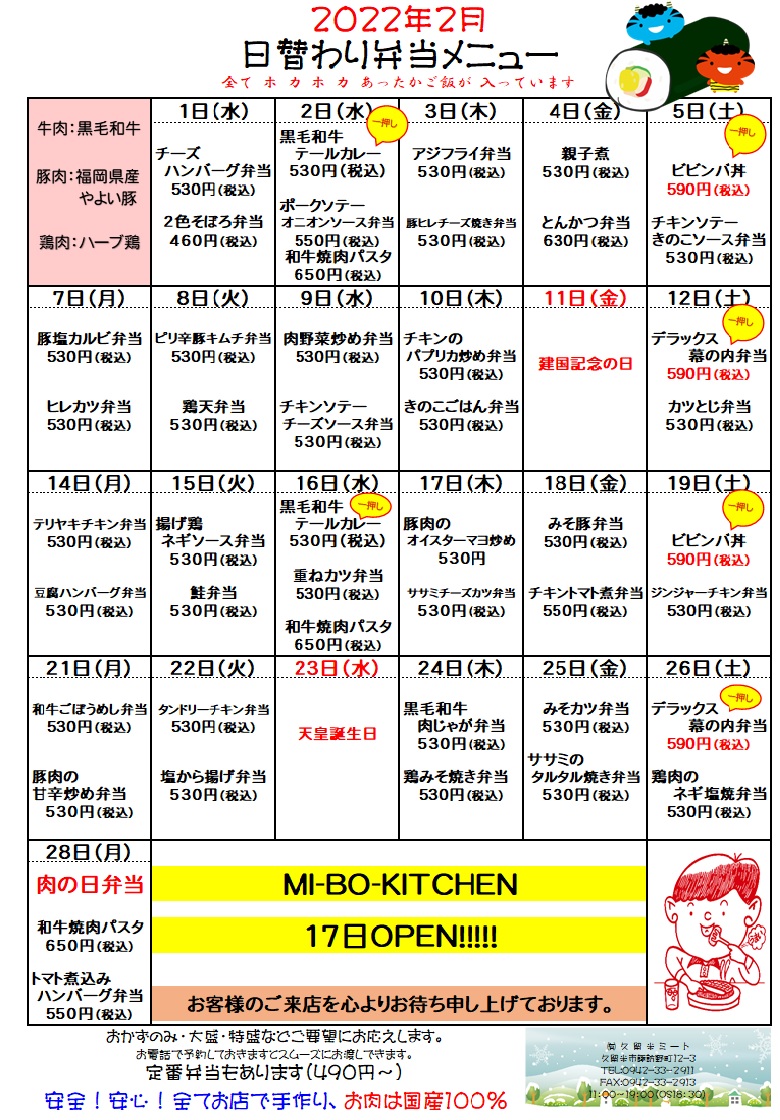 1 312022 2月の日替わりメニュー お知らせ Tweet Share Hatena Pocket RSS feedly Pin it 恵方巻2022 予約受付中 前の記事 3月の日替わりメニュー 次の記事