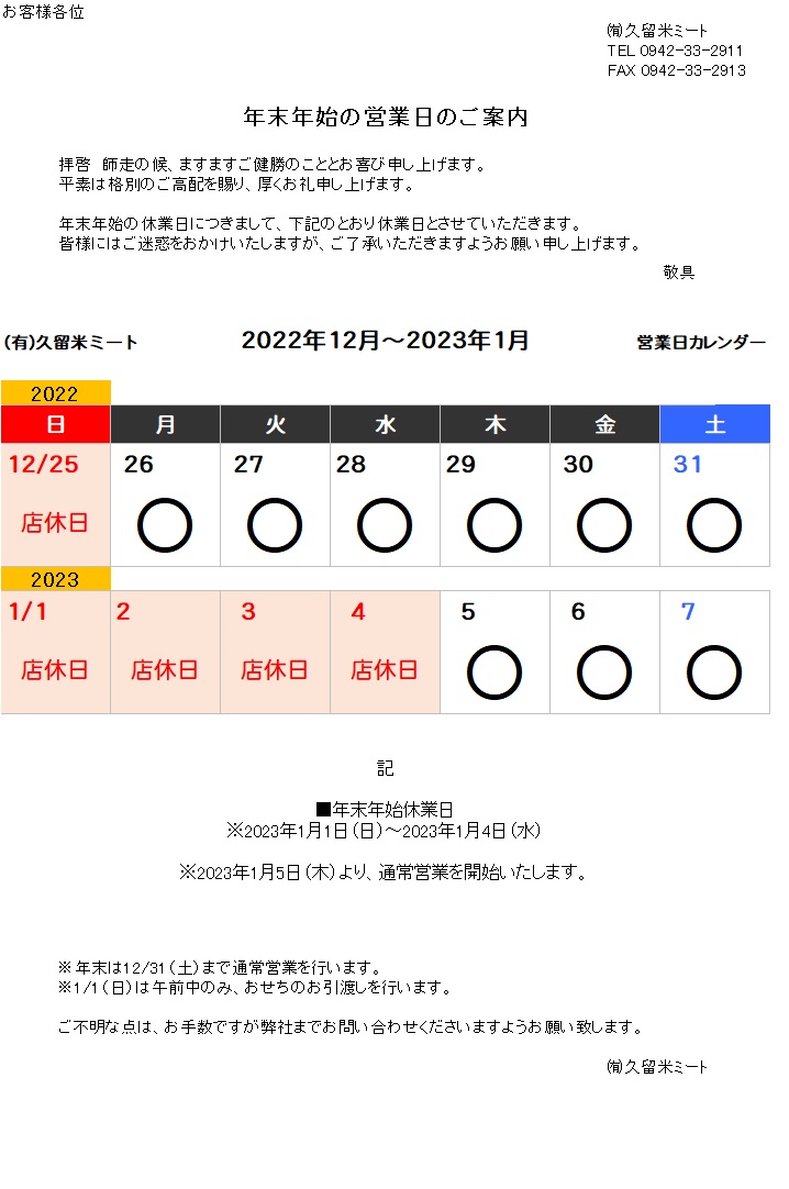 12 302022 年末年始の営業日について お知らせ Tweet Share Hatena Pocket RSS feedly Pin it 12月の日替わりメニュー 前の記事 2023年1月 日替わりメニュー 次の記事