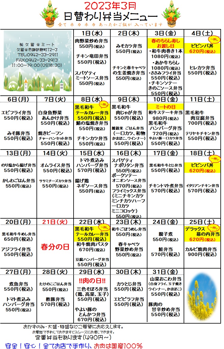 3 082023 2023年3月の日替わりメニュー お知らせ Tweet Share Hatena Pocket RSS feedly Pin it 2023年2月 日替わりメニュー 前の記事 2023年4月の日替わりメニュー 次の記事